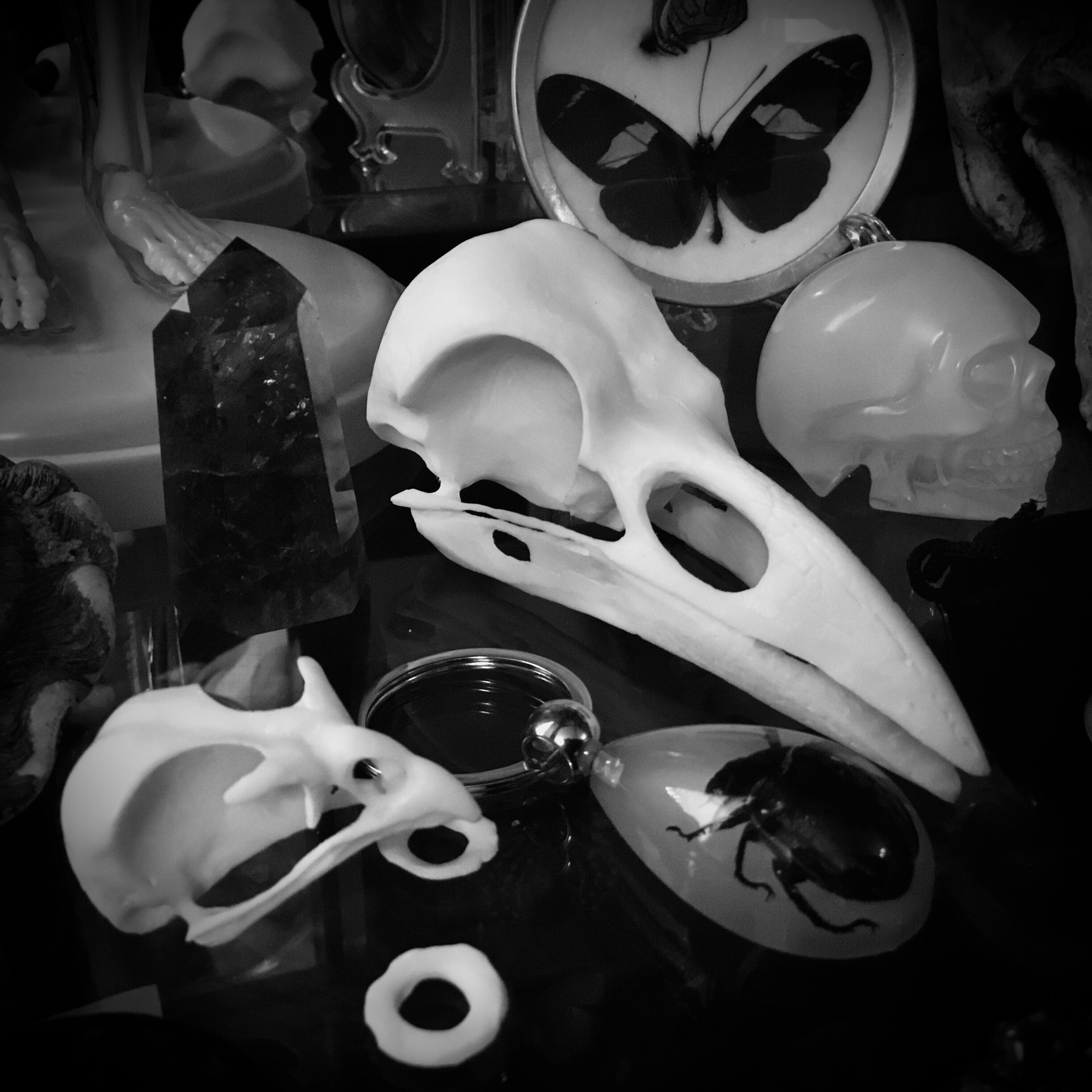 On the left is a raccoon skull by Crimson Rich Desire. (Can you tell how much I like this shop?) The skull on the right is a mystery species, and is real. I received it as a gift from my mother, despite telling her that I was superstitious. I havenāt been haunted by any critter ghosts yet so I guess Iām probably safe.