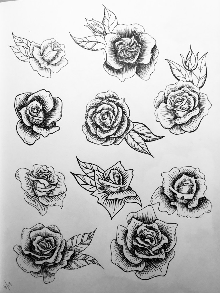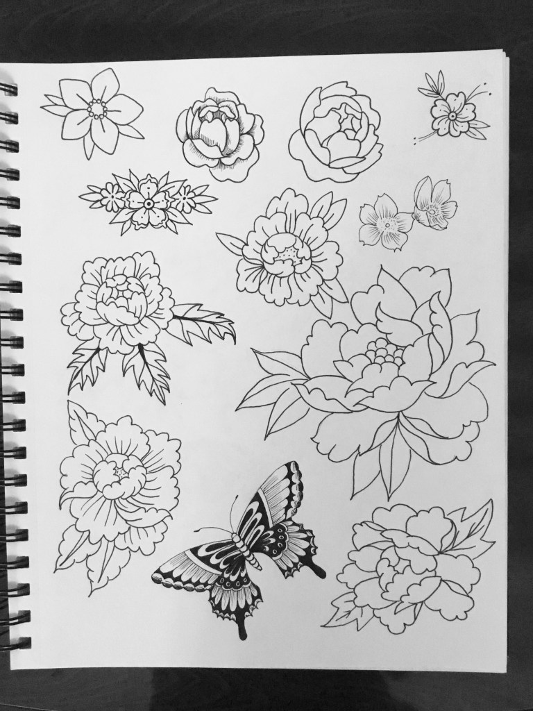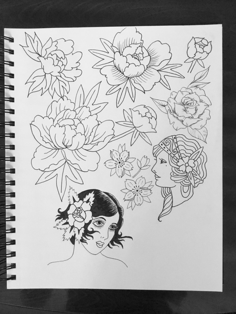 In a master study, I simply copy the drawing. I keep these drawings in a separate sketchbook I call the “copycat” sketchbook (hence the cat sticker on the front) to help remind myself to not use these drawings in finished works (but I do reference these drawings when I am coming up with my own versions). The master copies I do take less brain power to execute, so I end up doing more of these when I am tired and don’t feel like drawing. Recently I have fallen in love with traditional tattoo peonies and it has been fun to make several master copies of tattoo artist’s work and learn about their construction