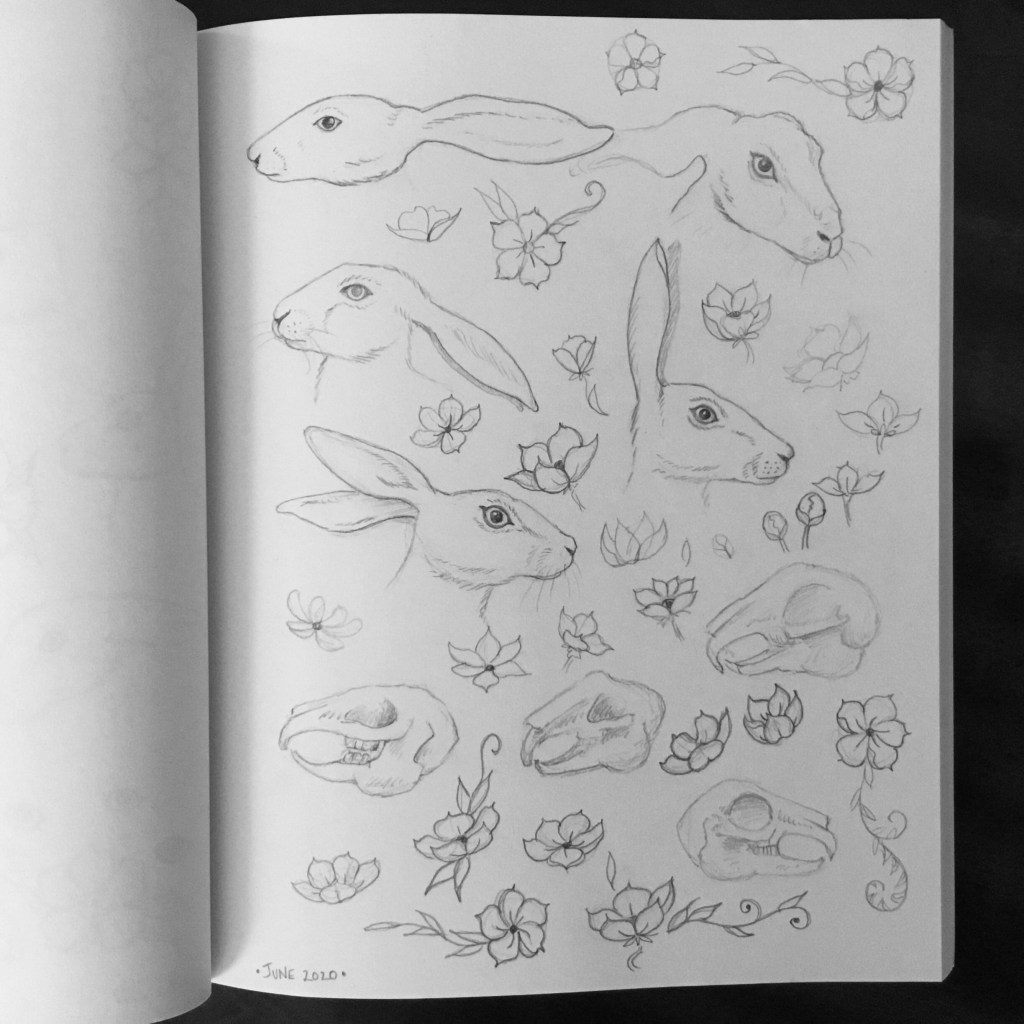 Practicing bunnies and flowers in my sketchbook for my most recent linocut print. Notice how these bunnies gradually get better the more that I draw them?