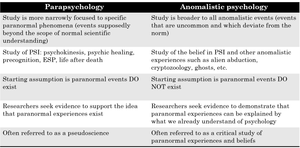 Psychologists have been studying people’s paranormal beliefs and paranormal experiences since the 1800’s. Two primary areas of study have emerged since this time: parapsychology and anomalistic psychology (the area of anomalistic psychology has been studied since the 1800’s but the term was not coined until 1989). Both areas of research are extremely small in the field of psychology. So small that many individuals who study psychology, do not even know both of these areas exist. Although both fields are focused on the study of paranormal experiences and beliefs, there are some important differences (listed in the table below).